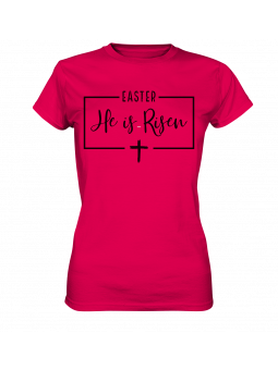 HE IS RISEN - Christliches T-Shirt für Frauen  Damen T-Shirt, Rundhals, 185 g/m², 100 % Baumwolle (ringgesponnen) / Ash: 99 % Baumwolle, 1 % Viskose / Sport Grey: 85 % Baumwolle, 15 % Polyester